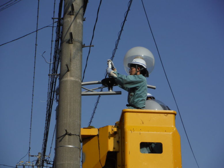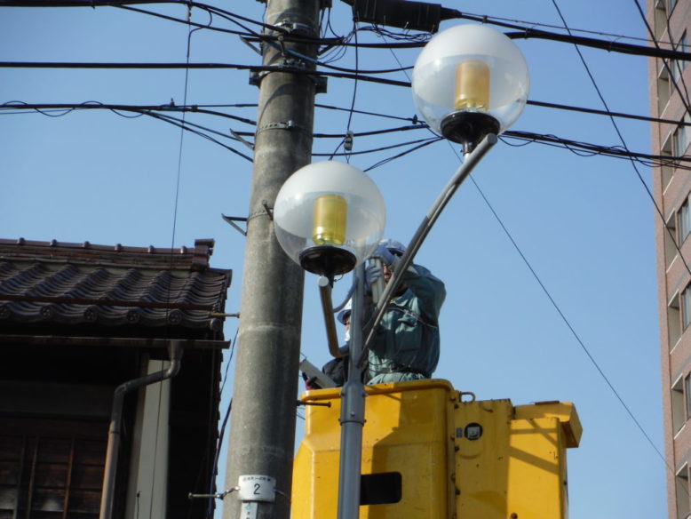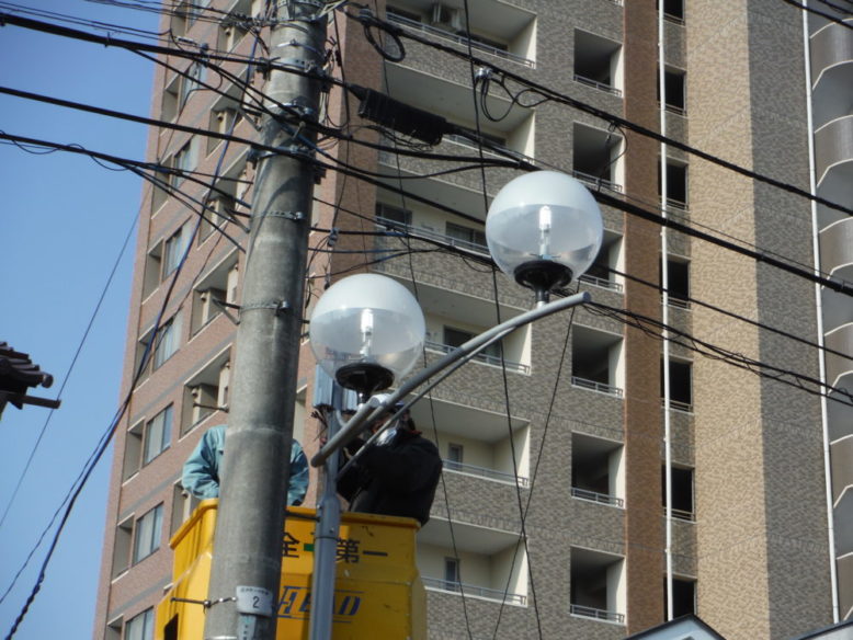 会津若松市内町内会様防犯灯LED化工事 所在地 会津若松市中央一丁目 施工時期 令和2年4月17日 工事概要 水銀ランプからLEDランプへ交換 2灯用4基、1灯用4基 ①交換前 ②安定器を撤去し、LED電源コンバータ設置 ③水銀ランプ取外し、LEDランプ取付 ④点滅器および各ケーブル結線し、点灯試験 ⑤完成