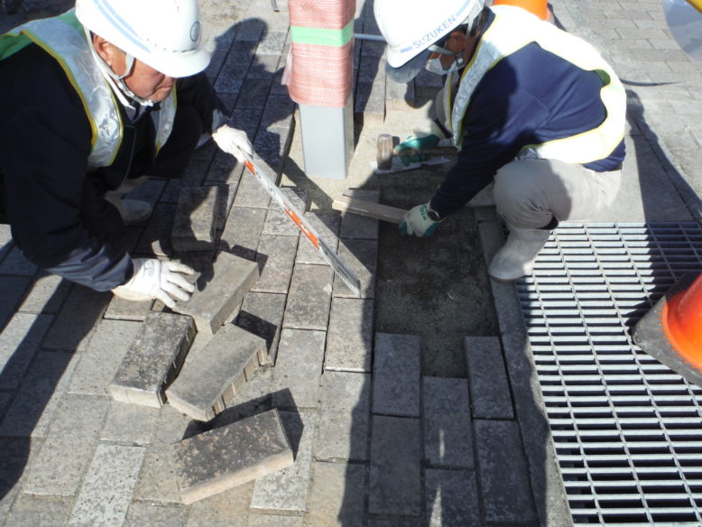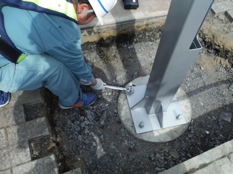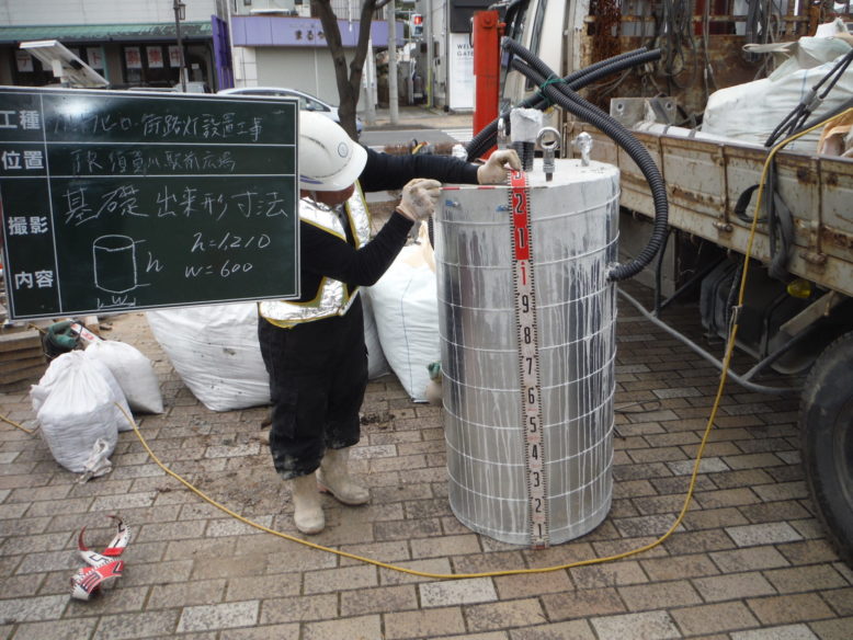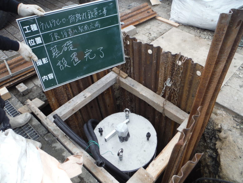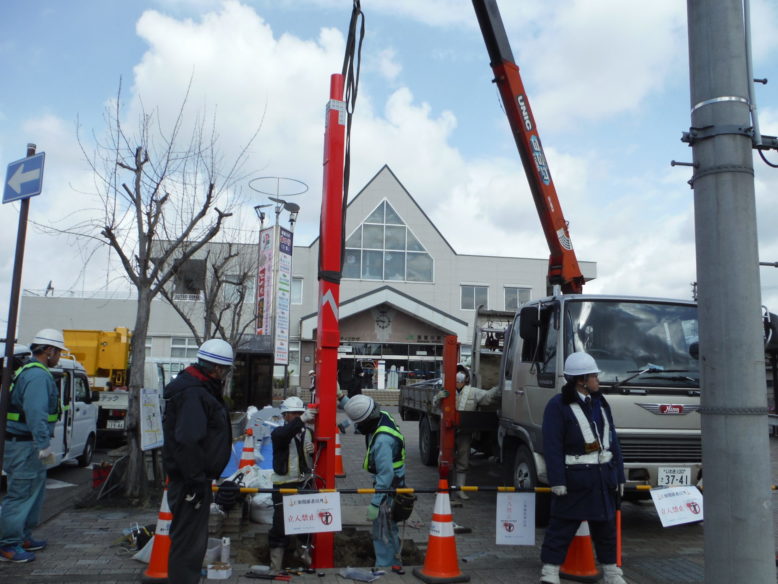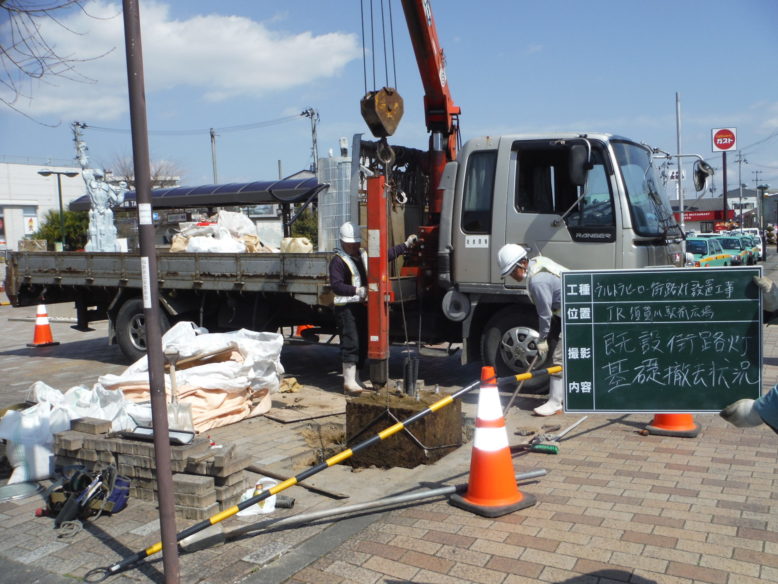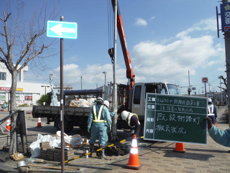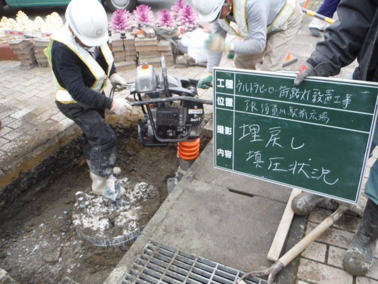 ウルトラヒーロー街路灯設置工事 所在地 福島県須賀川市 施工時期 平成28年3月 工事概要 JR須賀川駅前広場 特注デザイン街路灯2基設置 施工前 既設の街路灯を撤去します インターロッキング取外し コンクリート基礎撤去中 新たなコンクリート基礎 基礎を設置する前に填圧します コンクリート基礎設置完了 埋戻し後填圧 既設の電源幹線を新たなケーブルと交換します 柱を設置 設置後ボルトナット締め 灯具設置 停電時でも発光するサポートライト設置 規定の砕石敷設→填圧→山砂敷設→填圧→インターロッキング再設置 珪砂を撒いて、隙間に埋めます 完成① 完成② 点灯式