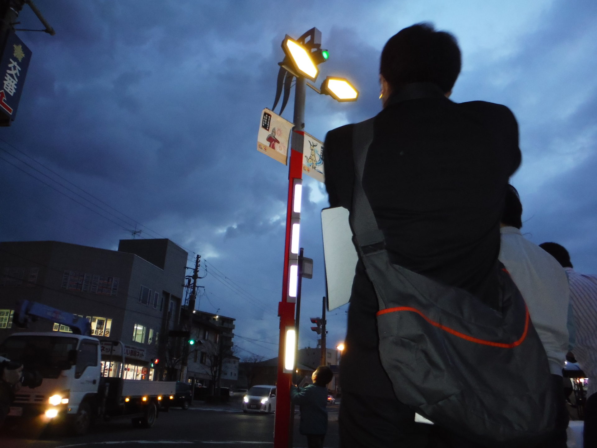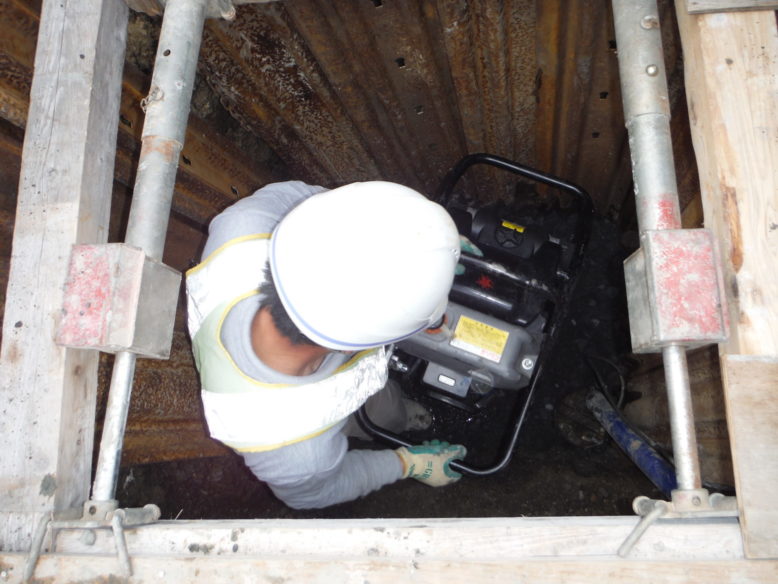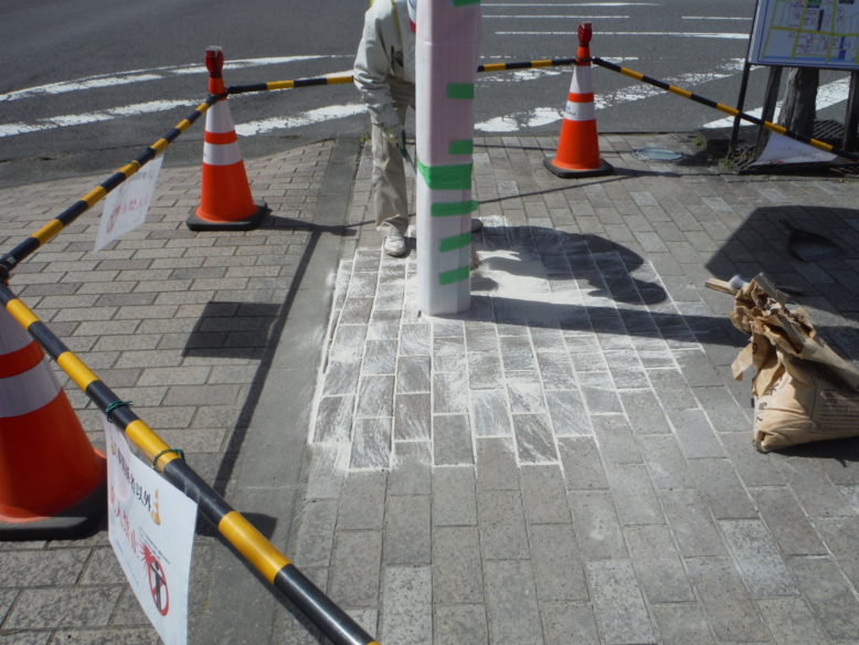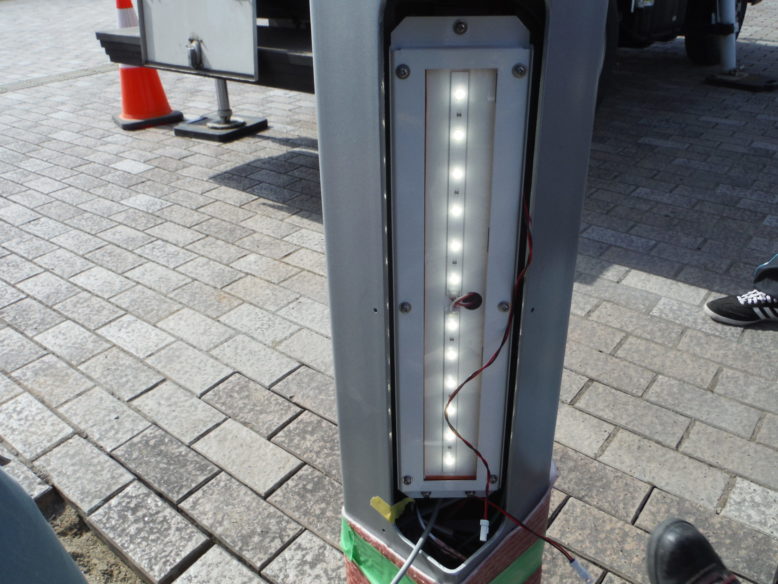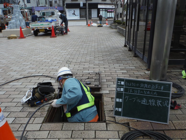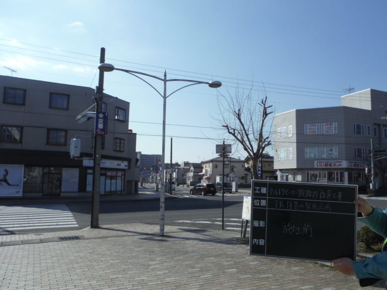 ウルトラヒーロー街路灯設置工事 所在地 福島県須賀川市 施工時期 平成28年3月 工事概要 JR須賀川駅前広場 特注デザイン街路灯2基設置 施工前 既設の街路灯を撤去します インターロッキング取外し コンクリート基礎撤去中 新たなコンクリート基礎 基礎を設置する前に填圧します コンクリート基礎設置完了 埋戻し後填圧 既設の電源幹線を新たなケーブルと交換します 柱を設置 設置後ボルトナット締め 灯具設置 停電時でも発光するサポートライト設置 規定の砕石敷設→填圧→山砂敷設→填圧→インターロッキング再設置 珪砂を撒いて、隙間に埋めます 完成① 完成② 点灯式
